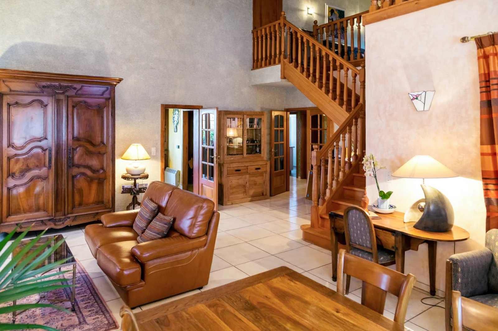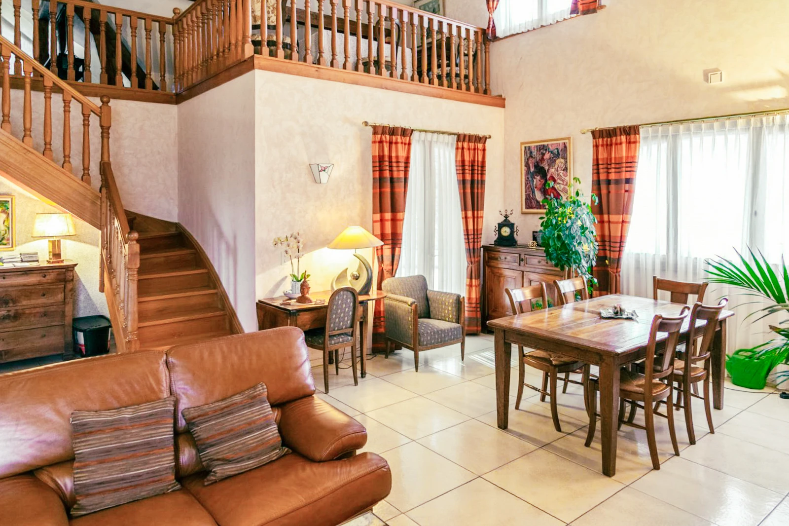 Développant près de 600 m², la maison se distingue par ses volumes généreux et sa luminosité. La pièce de réception, dotée d’une cheminée et de belles hauteurs sous plafond, s’ouvre sur deux espaces extérieurs orientés Est et Ouest. La cuisine, indépendante, offre un cadre fonctionnel et convivial.