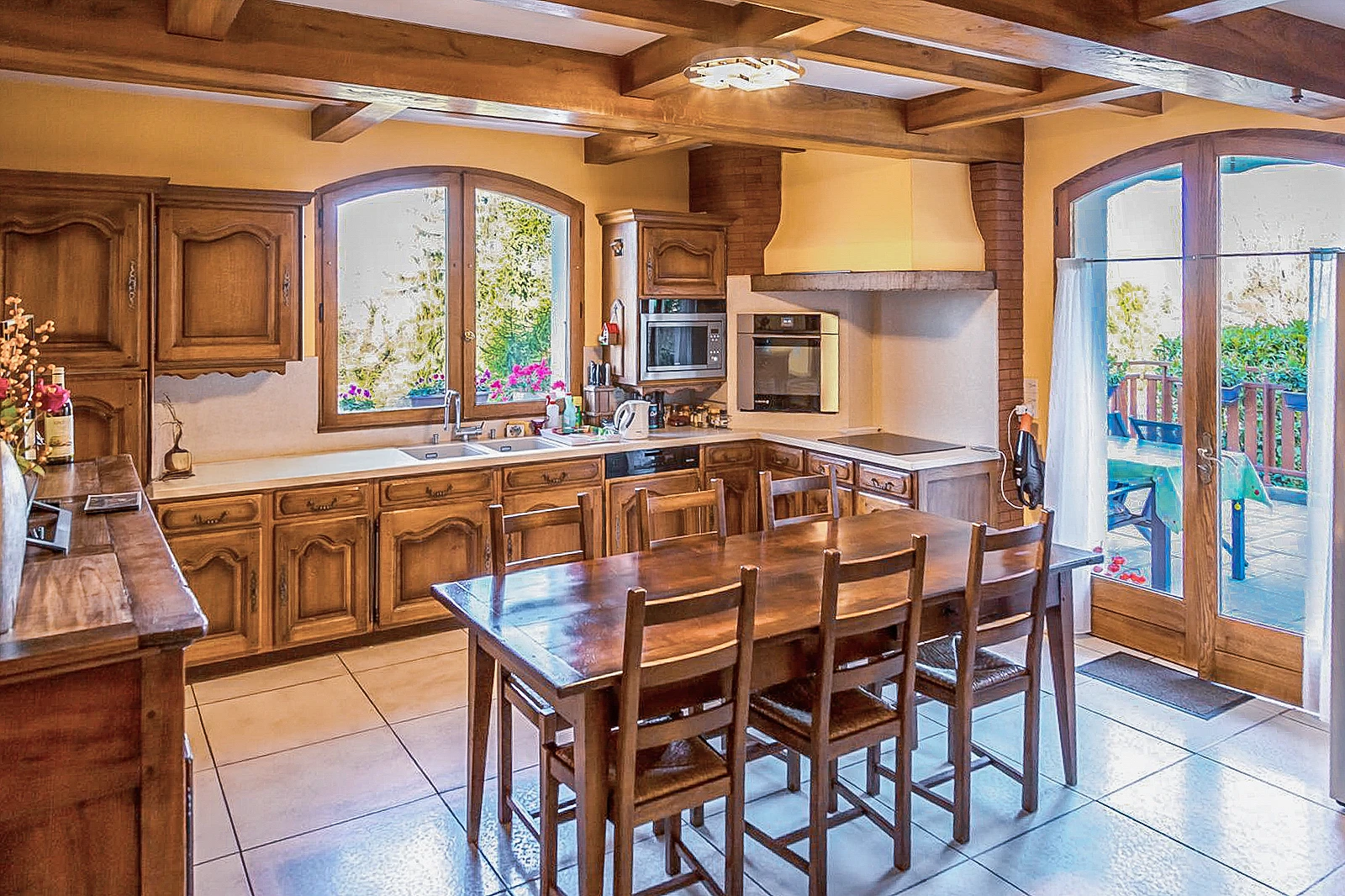 With nearly 600 sqm of living space, the house stands out for its generous volumes and abundant natural light. The main reception room features a fireplace and impressive ceiling heights, opening onto two outdoor living areas facing east and west. The separate kitchen is both functional and welcoming.