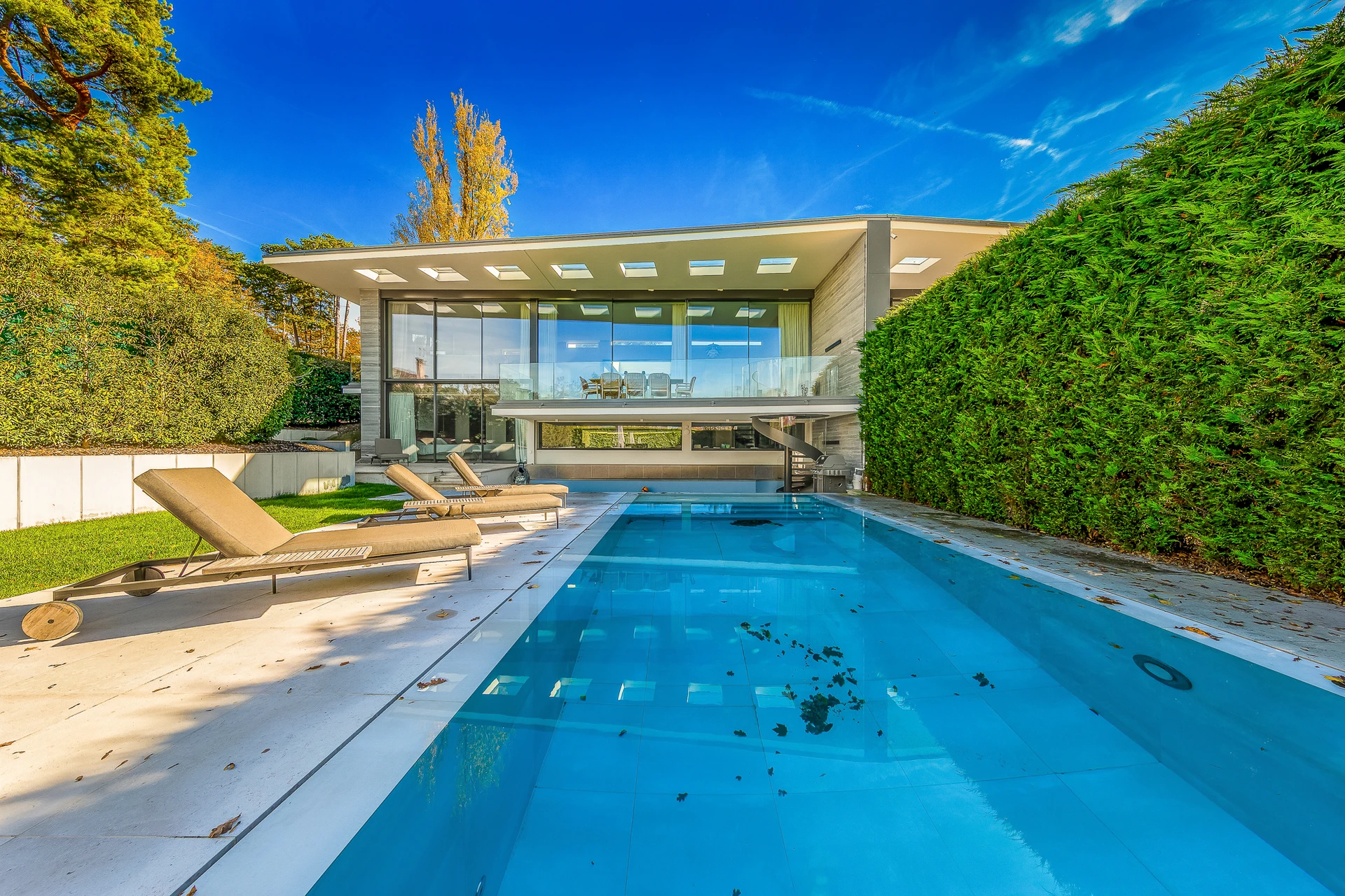 Built in 2021, this contemporary high-end residence offers more than 600 m² of usable space spread across three levels. It features private access to the lake as well as a landscaped garden with a swimming pool, extending the living areas into a luxurious outdoor environment.