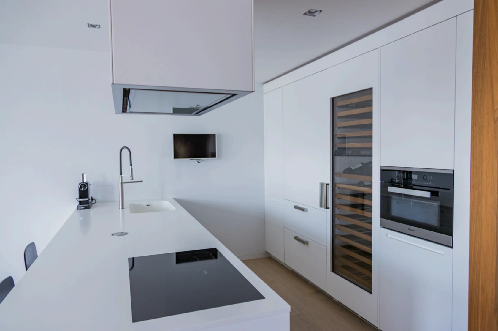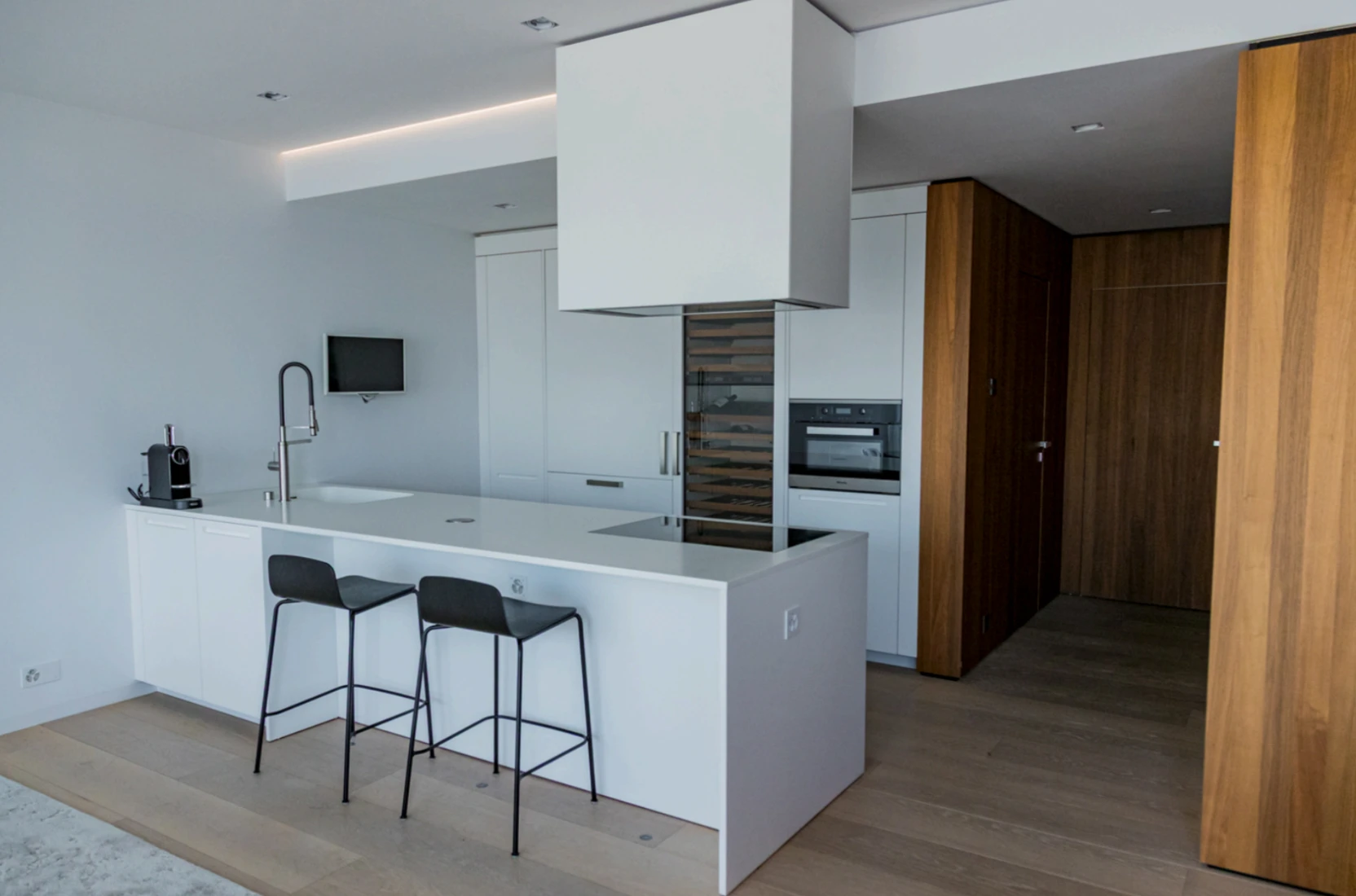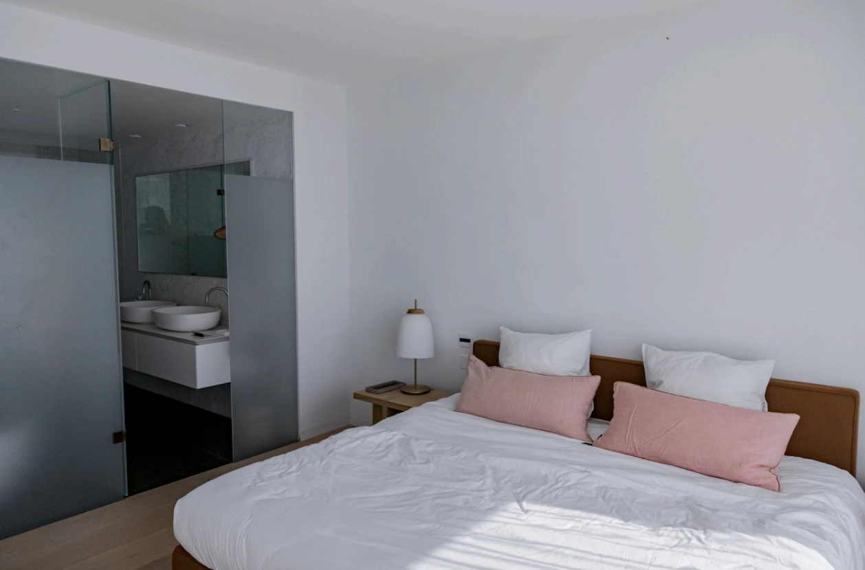 L’espace de vie s’articule autour d’un vaste salon avec salle à manger et d’une cuisine design Boffi équipée d’appareils Miele. Les deux chambres, chacune avec leur salle de bain attenante et leur dressing sur mesure, garantissent intimité et fonctionnalité.