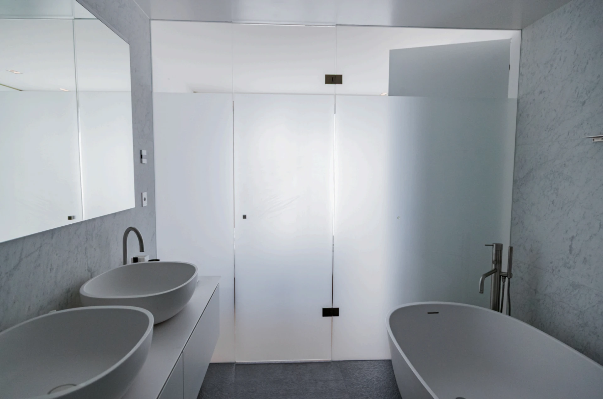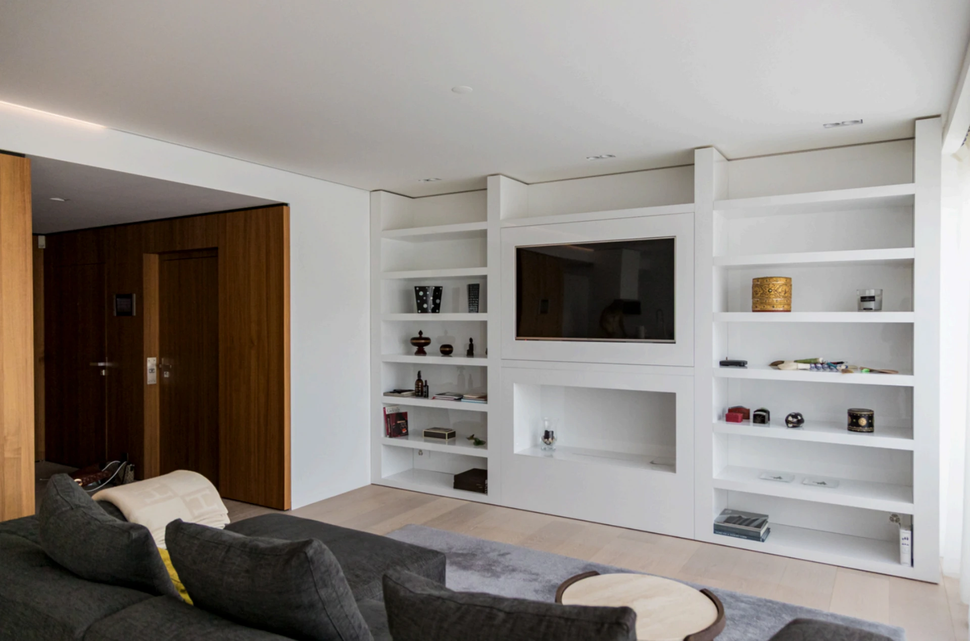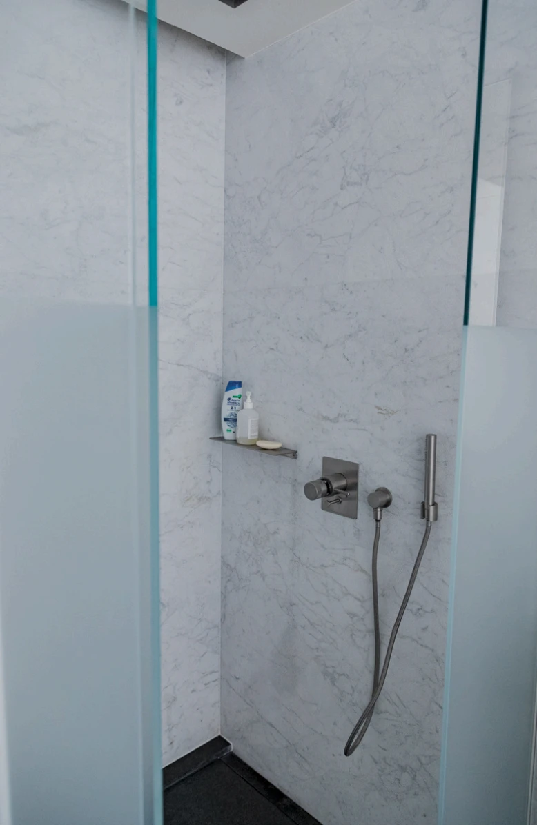 L’espace de vie s’articule autour d’un vaste salon avec salle à manger et d’une cuisine design Boffi équipée d’appareils Miele. Les deux chambres, chacune avec leur salle de bain attenante et leur dressing sur mesure, garantissent intimité et fonctionnalité.