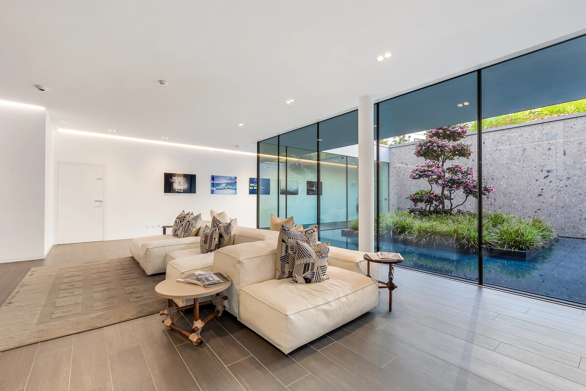 The living space is centered around a spacious lounge with a dining area and a Boffi-designed kitchen equipped with Miele appliances. The two bedrooms, each with its own en-suite bathroom and custom-made dressing room, ensure both privacy and functionality.