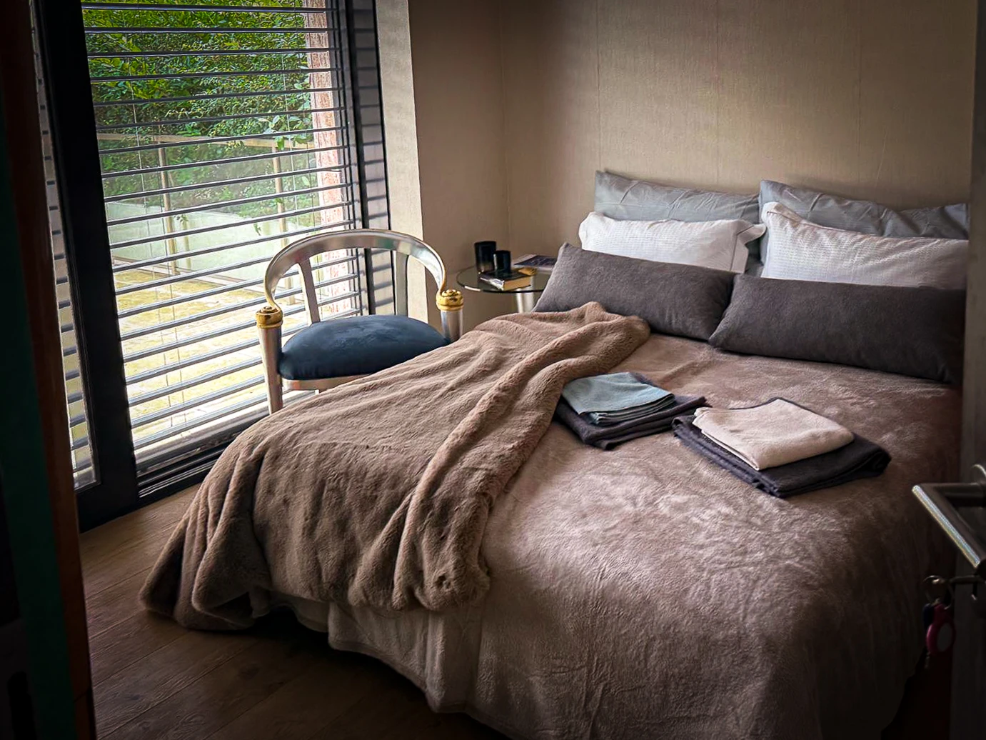 La partie nuit offre deux chambres, dont une avec salle d’eau attenante, ainsi qu’une salle de bains séparée.