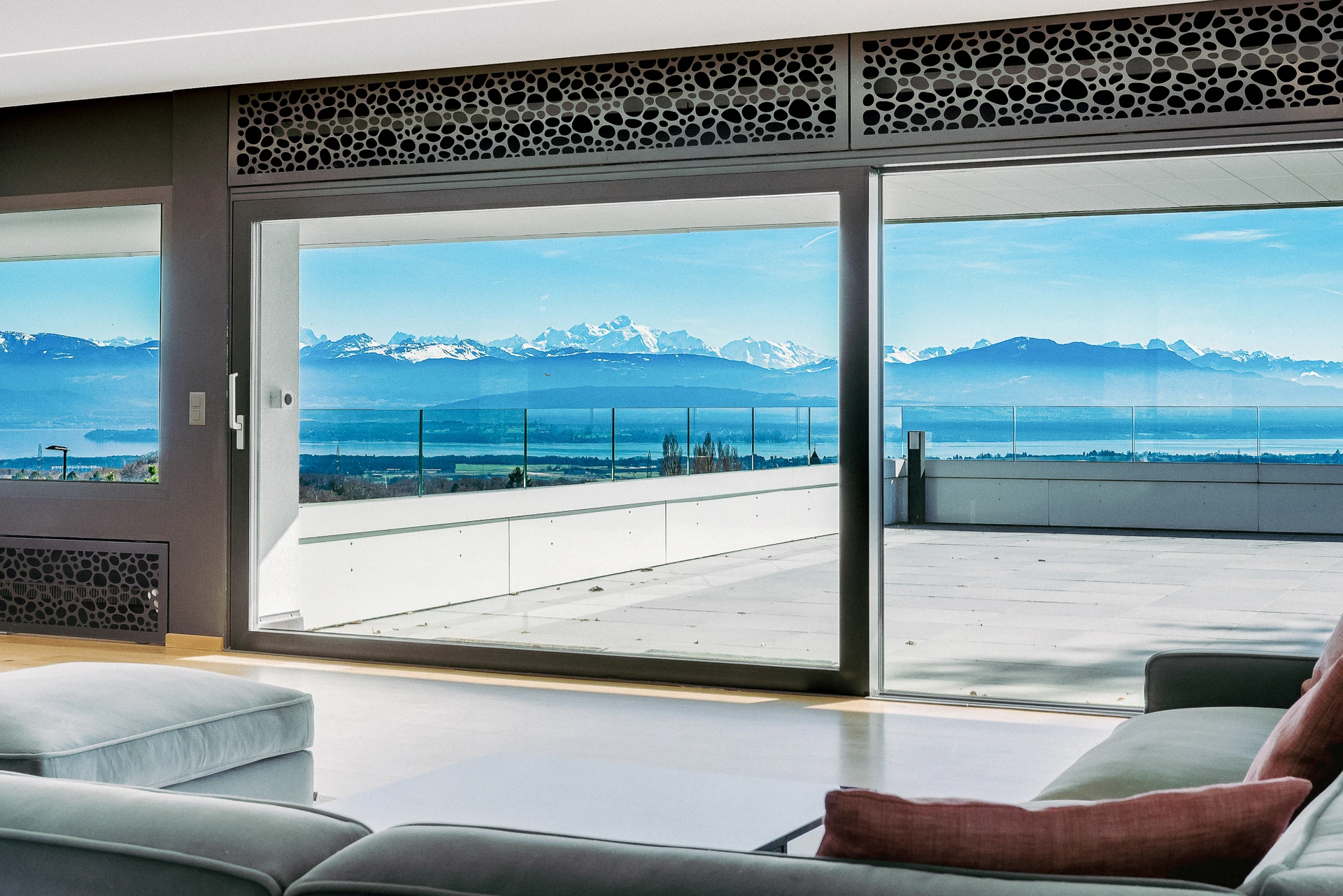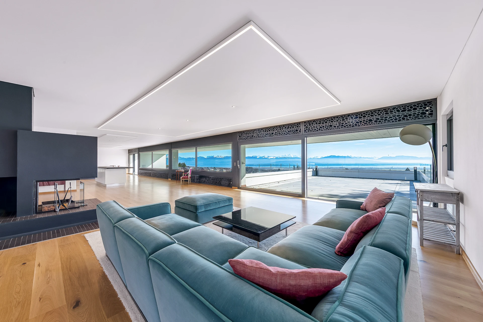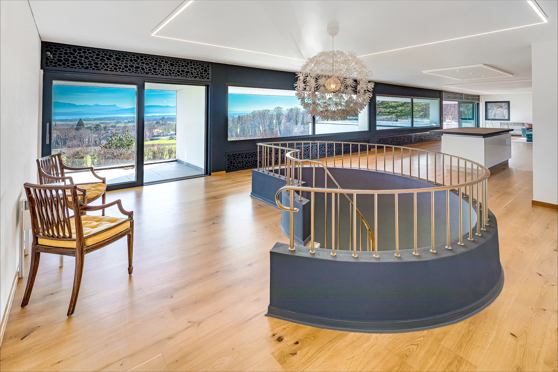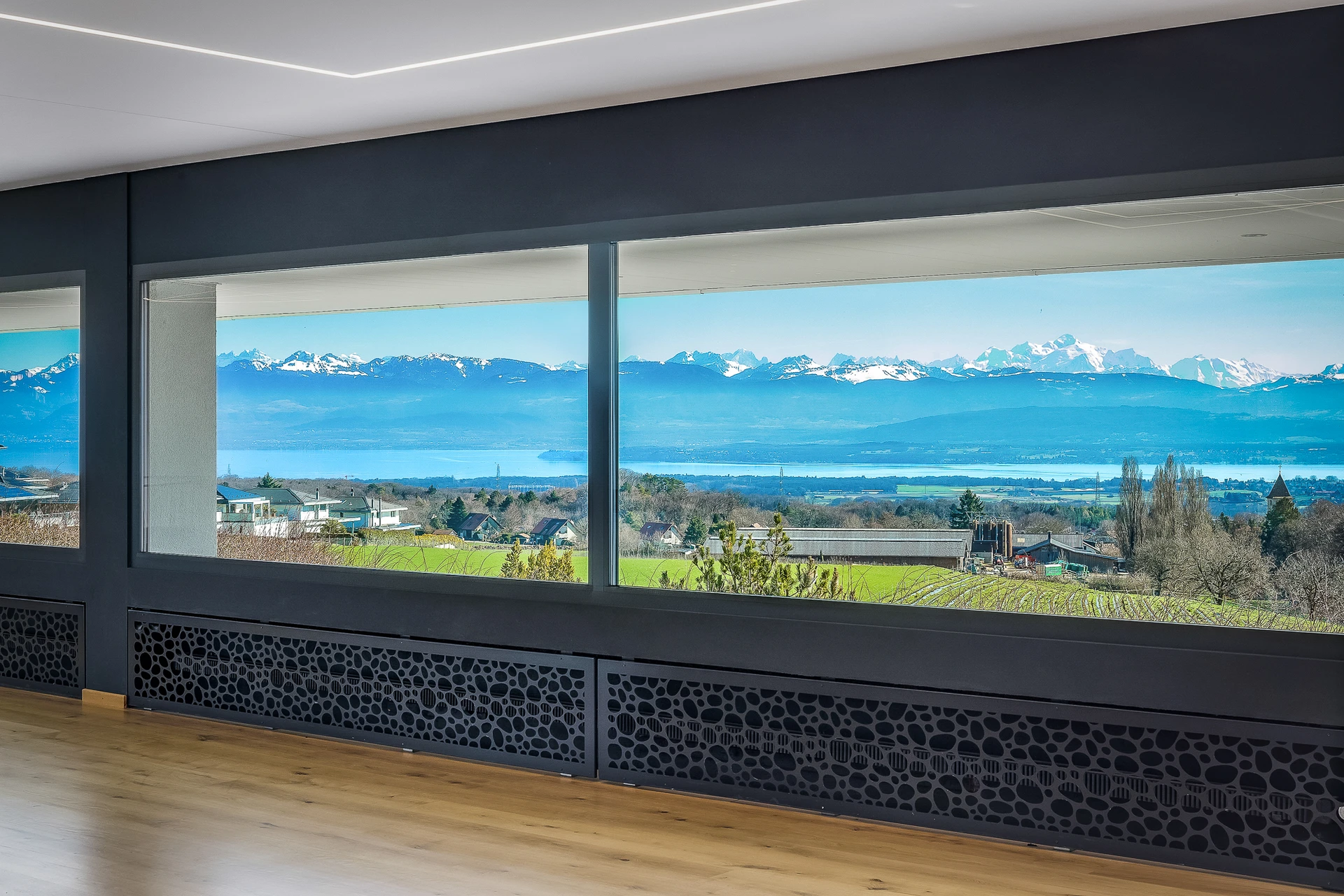 Set within a beautifully landscaped and tree-filled park, surrounded by agricultural land, this Finnish-inspired architectural residence was designed by Aarno Ruusuvuori. The home impresses with its modern lines, outstanding natural light and generous volumes, offering breathtaking panoramic views over Lake Geneva and Mont Blanc.