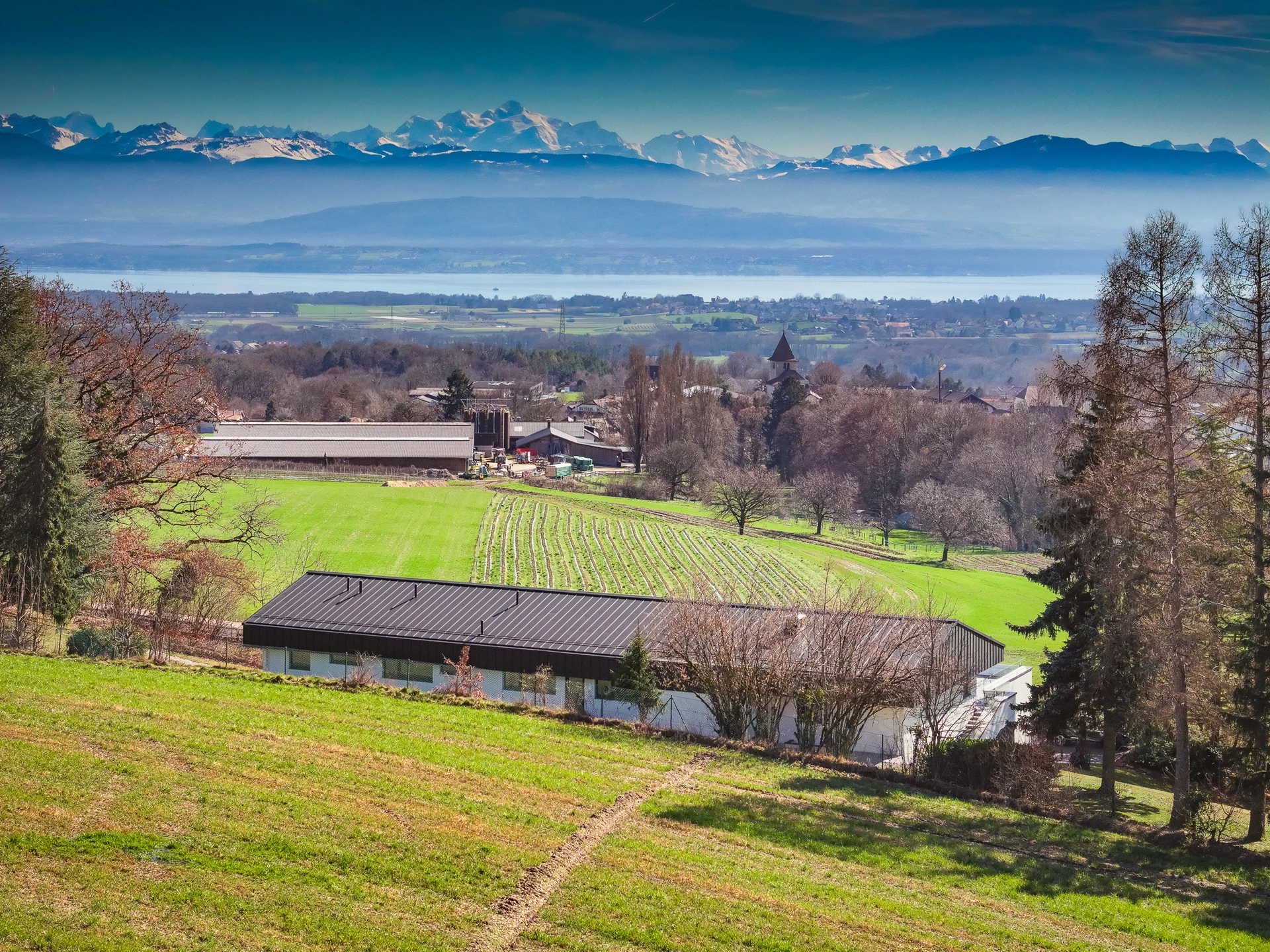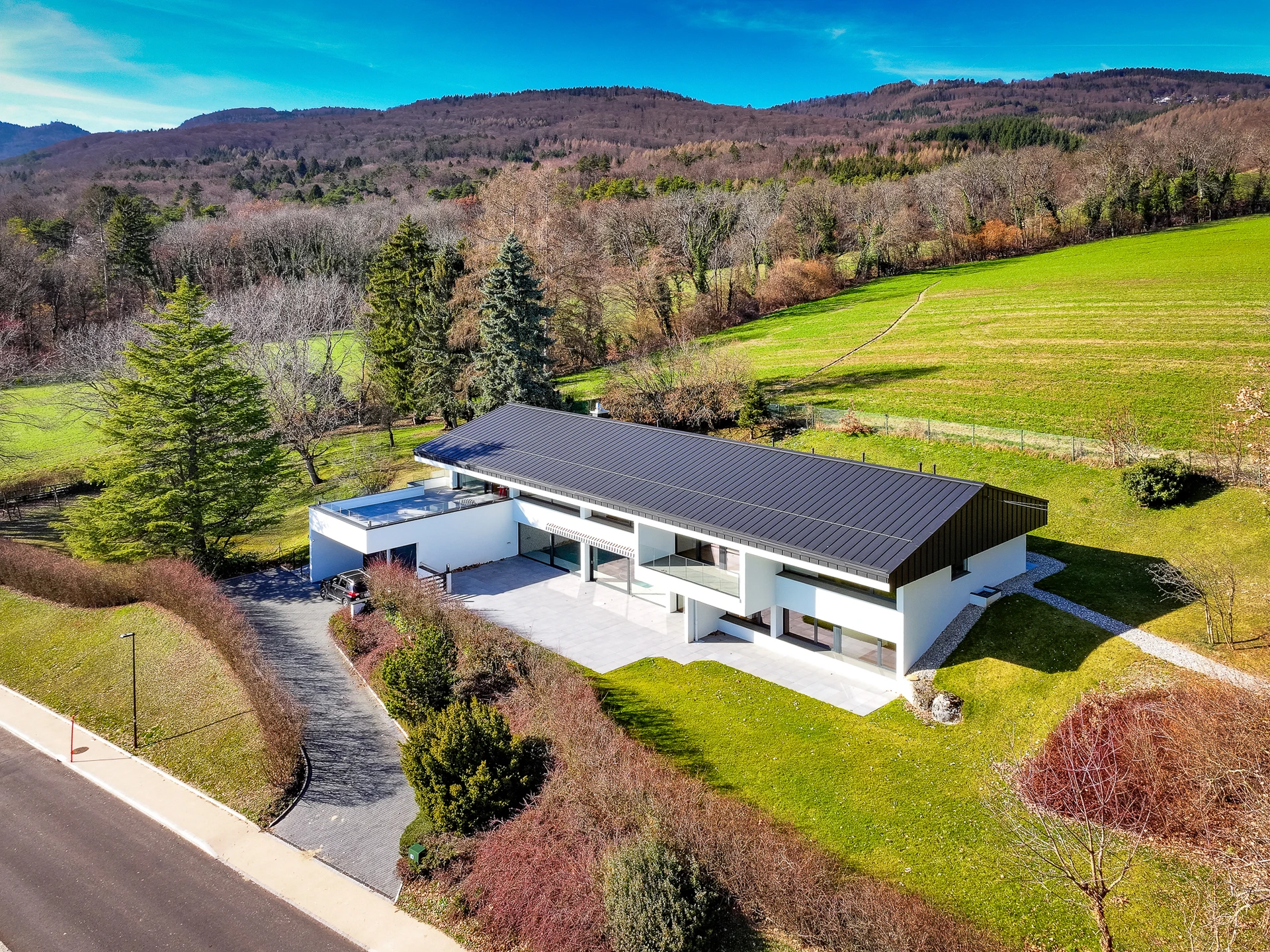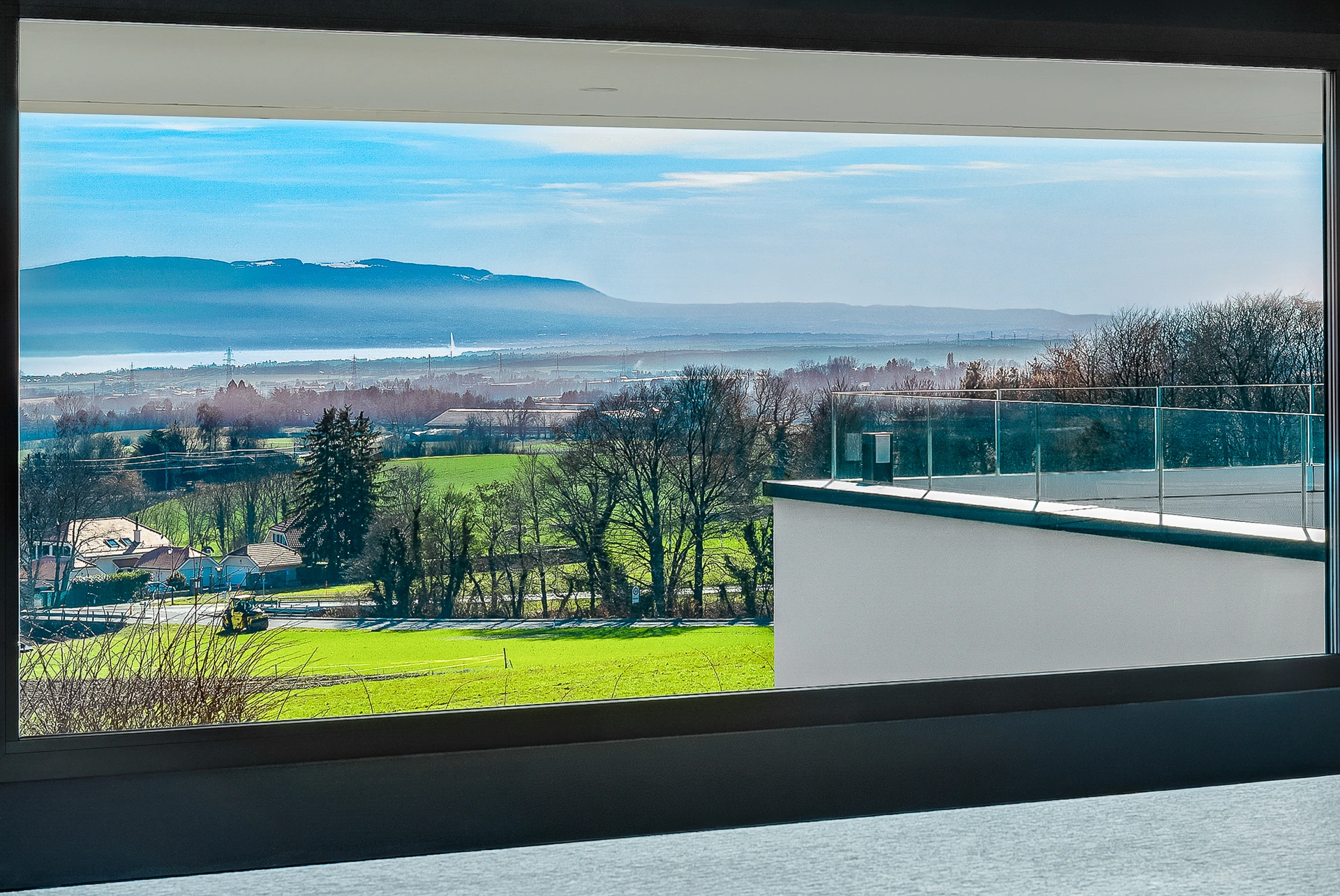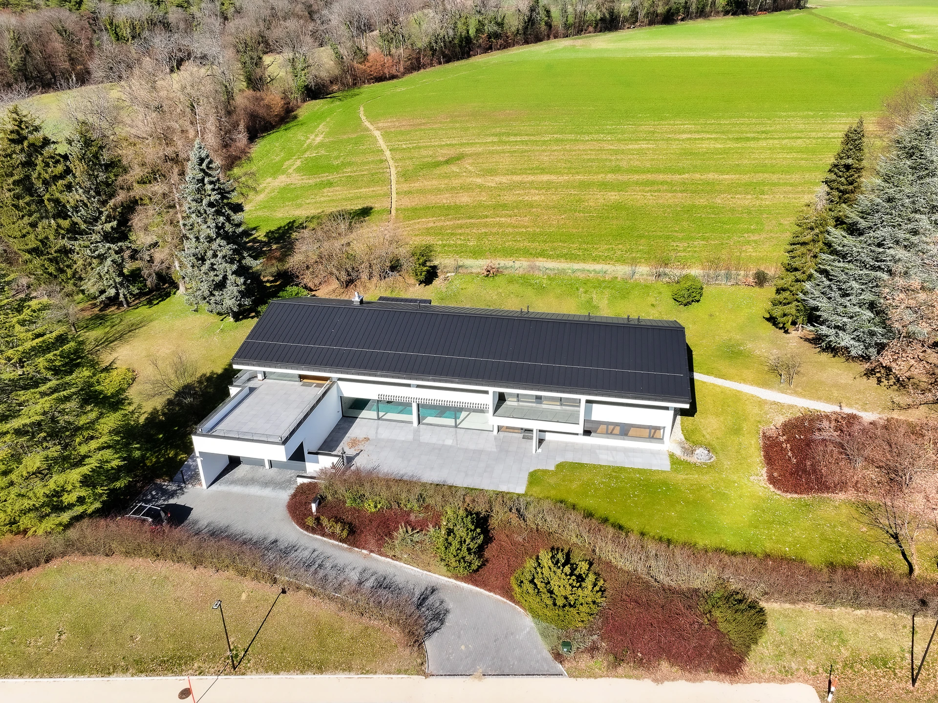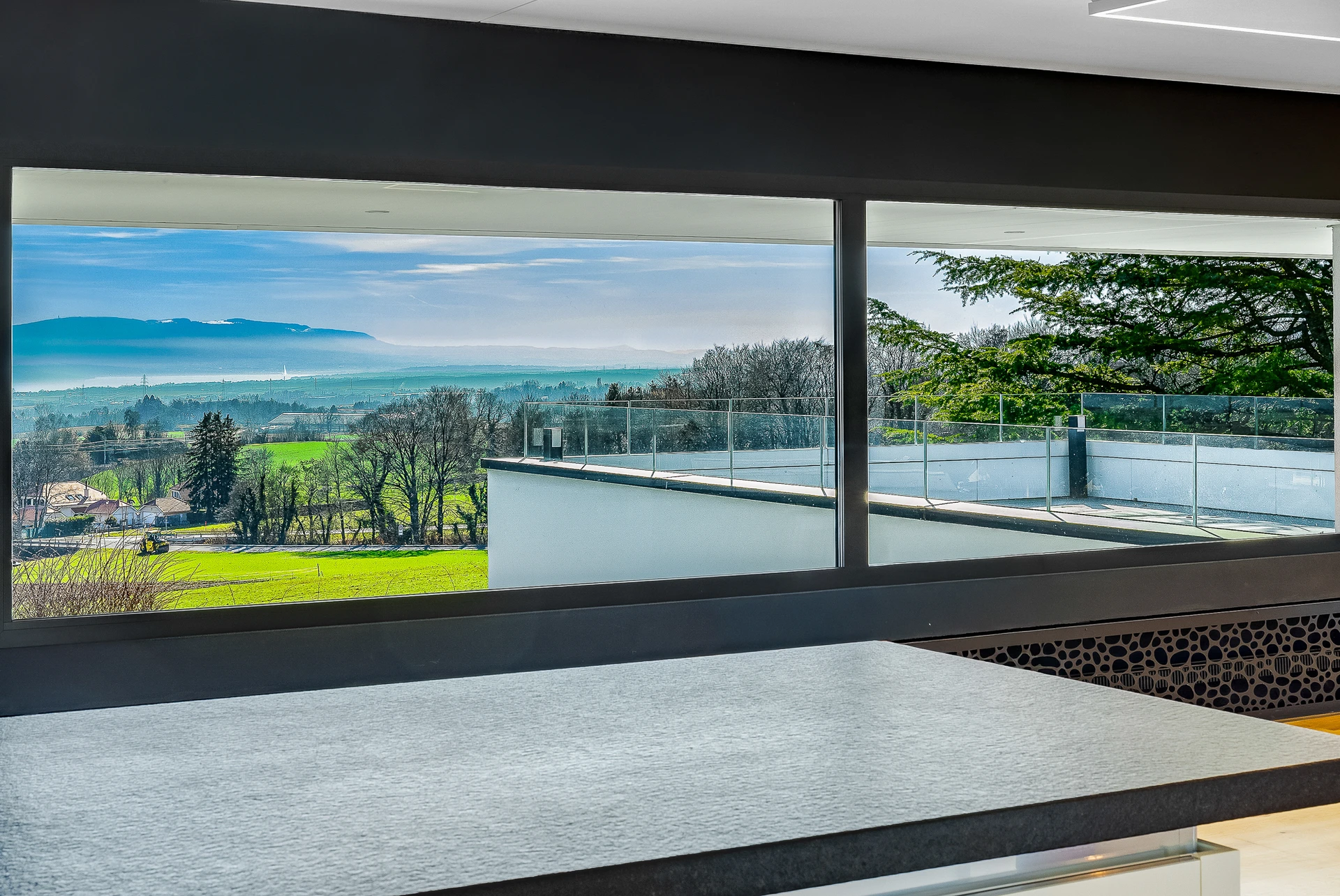 Set within a beautifully landscaped and tree-filled park, surrounded by agricultural land, this Finnish-inspired architectural residence was designed by Aarno Ruusuvuori. The home impresses with its modern lines, outstanding natural light and generous volumes, offering breathtaking panoramic views over Lake Geneva and Mont Blanc.