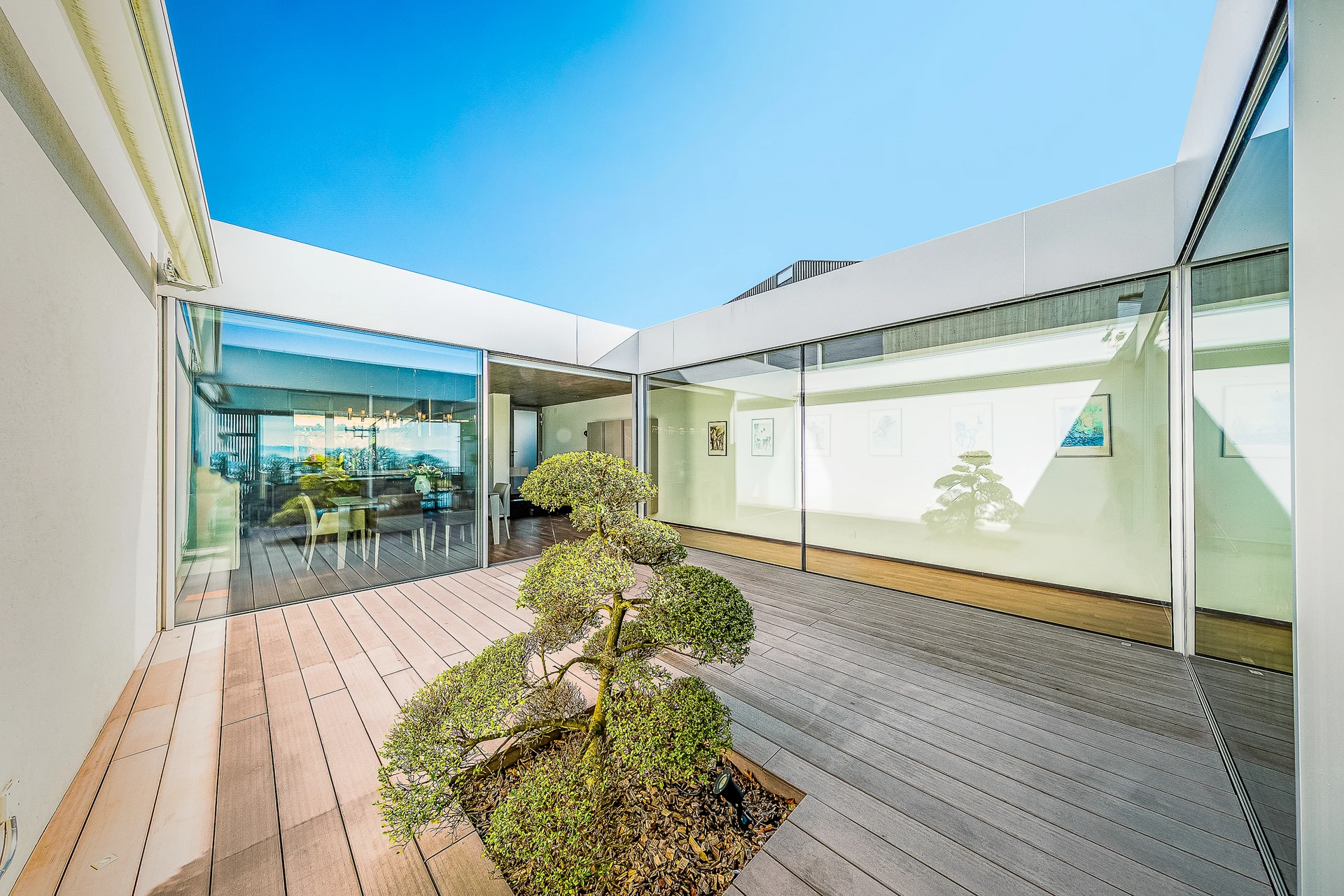 Dès l’entrée, les volumes généreux et la luminosité omniprésente séduisent immédiatement. La pièce de vie traversante, aux lignes contemporaines et raffinées, s’ouvre naturellement sur de magnifiques espaces extérieurs : un patio privatif de 26 m² ainsi qu’une superbe terrasse de 33 m². La cuisine ouverte, moderne et entièrement équipée, s’intègre parfaitement à cet espace convivial.