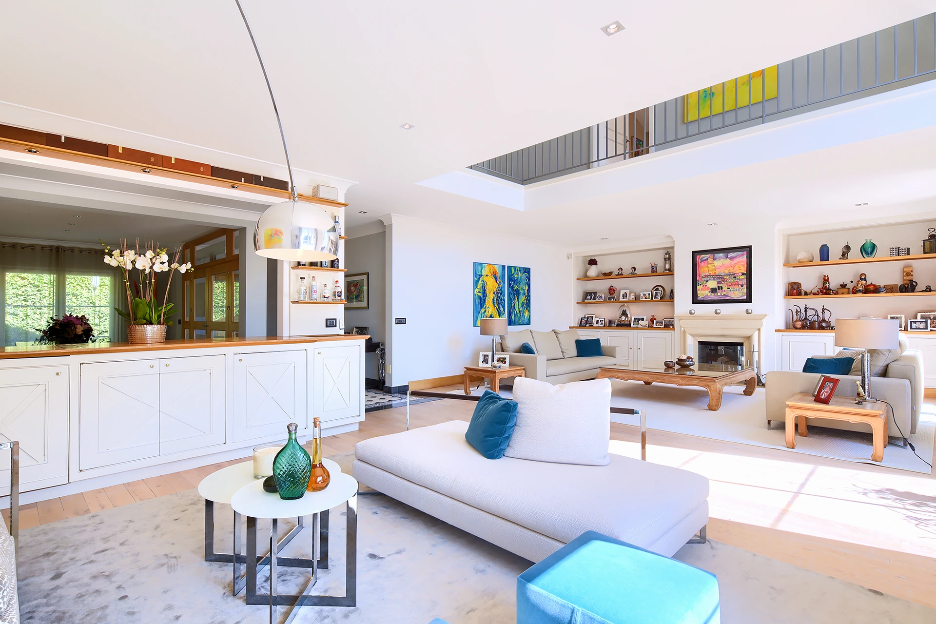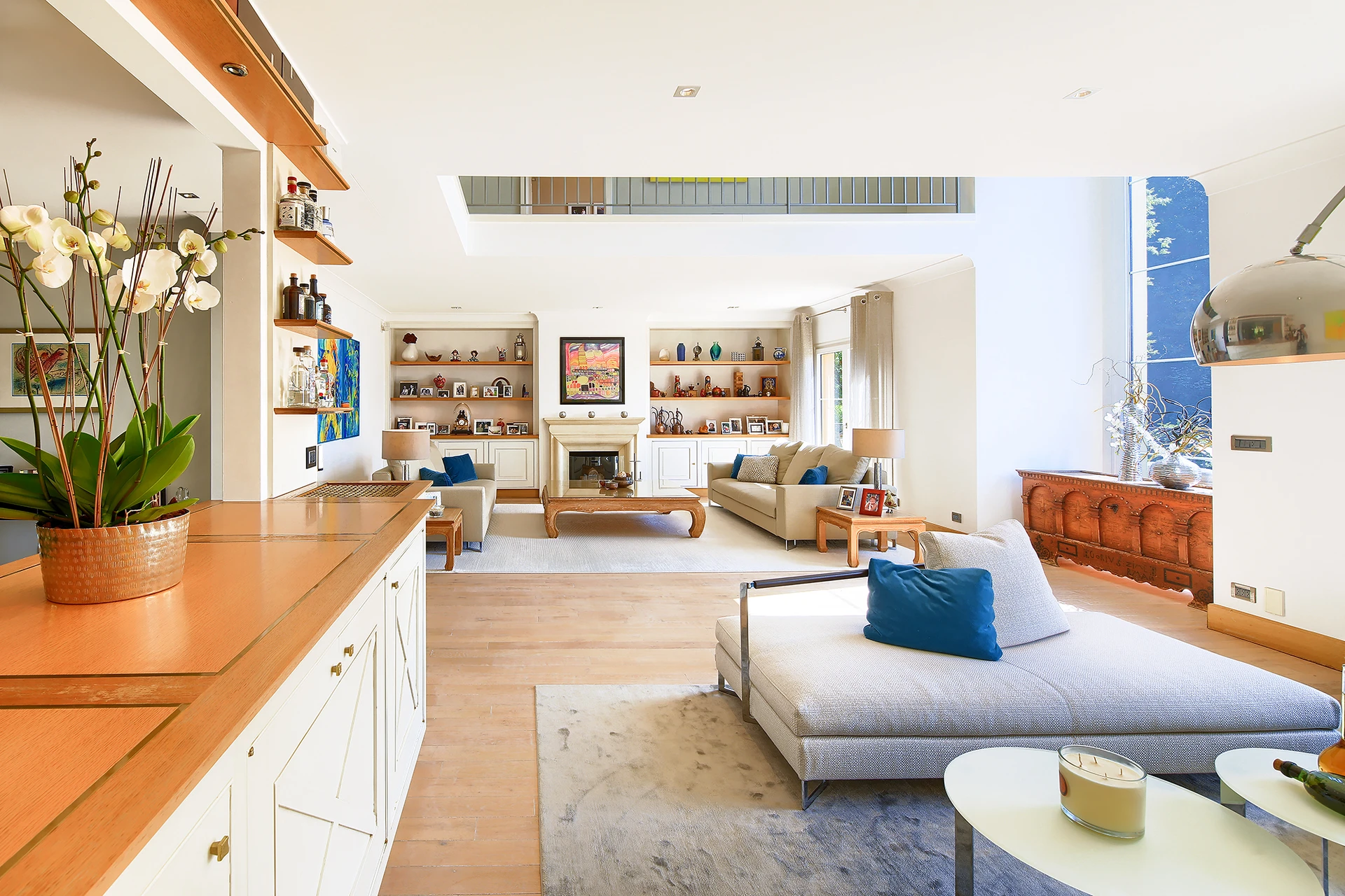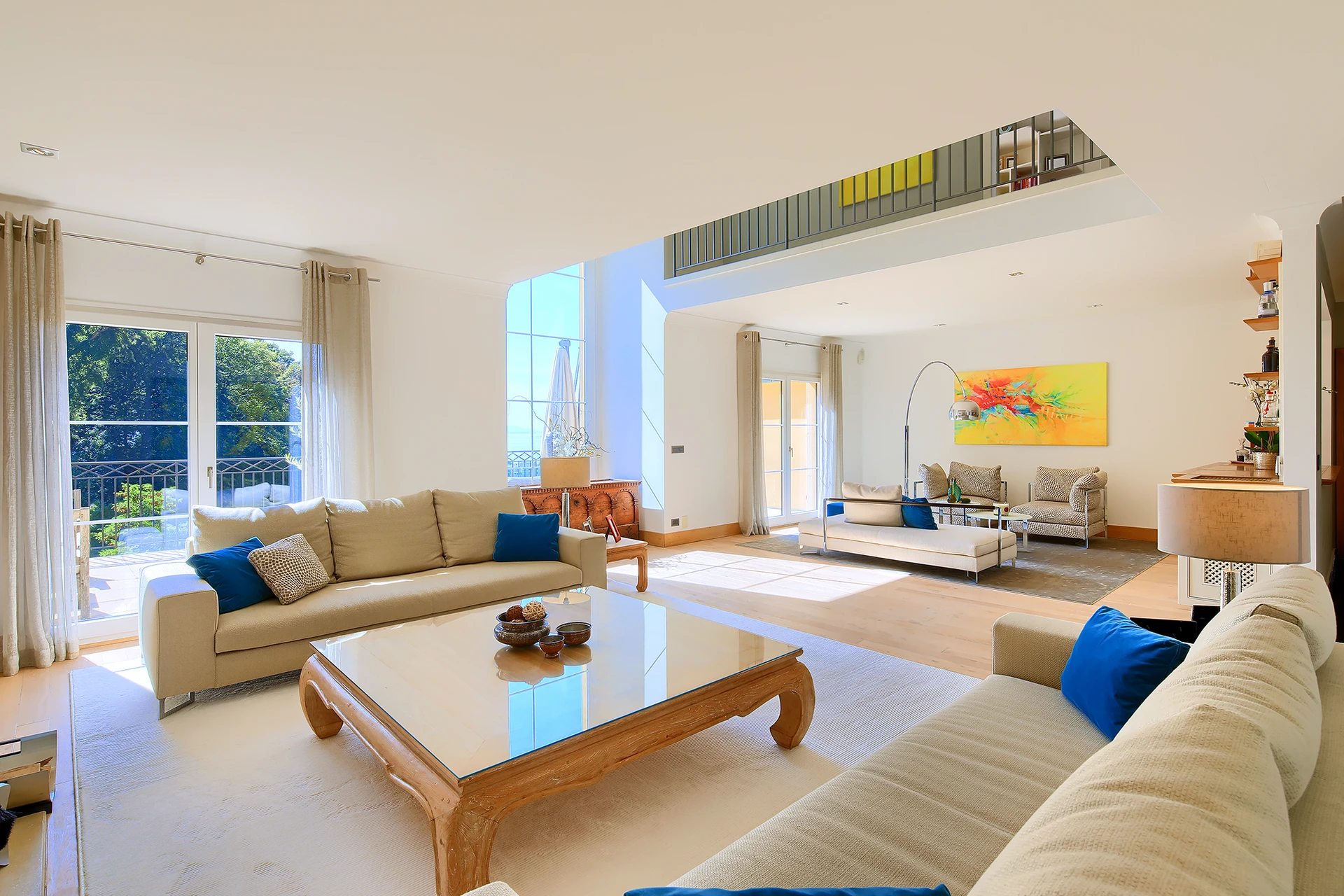 Les hauts plafonds, la lumière naturelle omniprésente et les grandes baies vitrées créent une atmosphère à la fois chaleureuse et raffinée, tandis que les multiples terrasses et la mezzanine invitent à profiter pleinement de la vue spectaculaire.