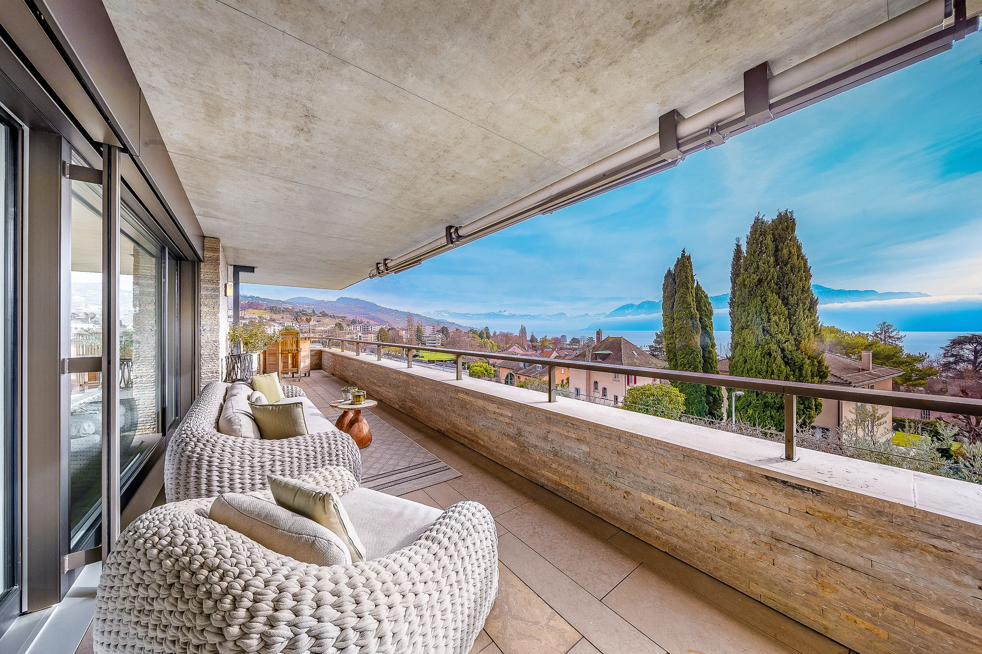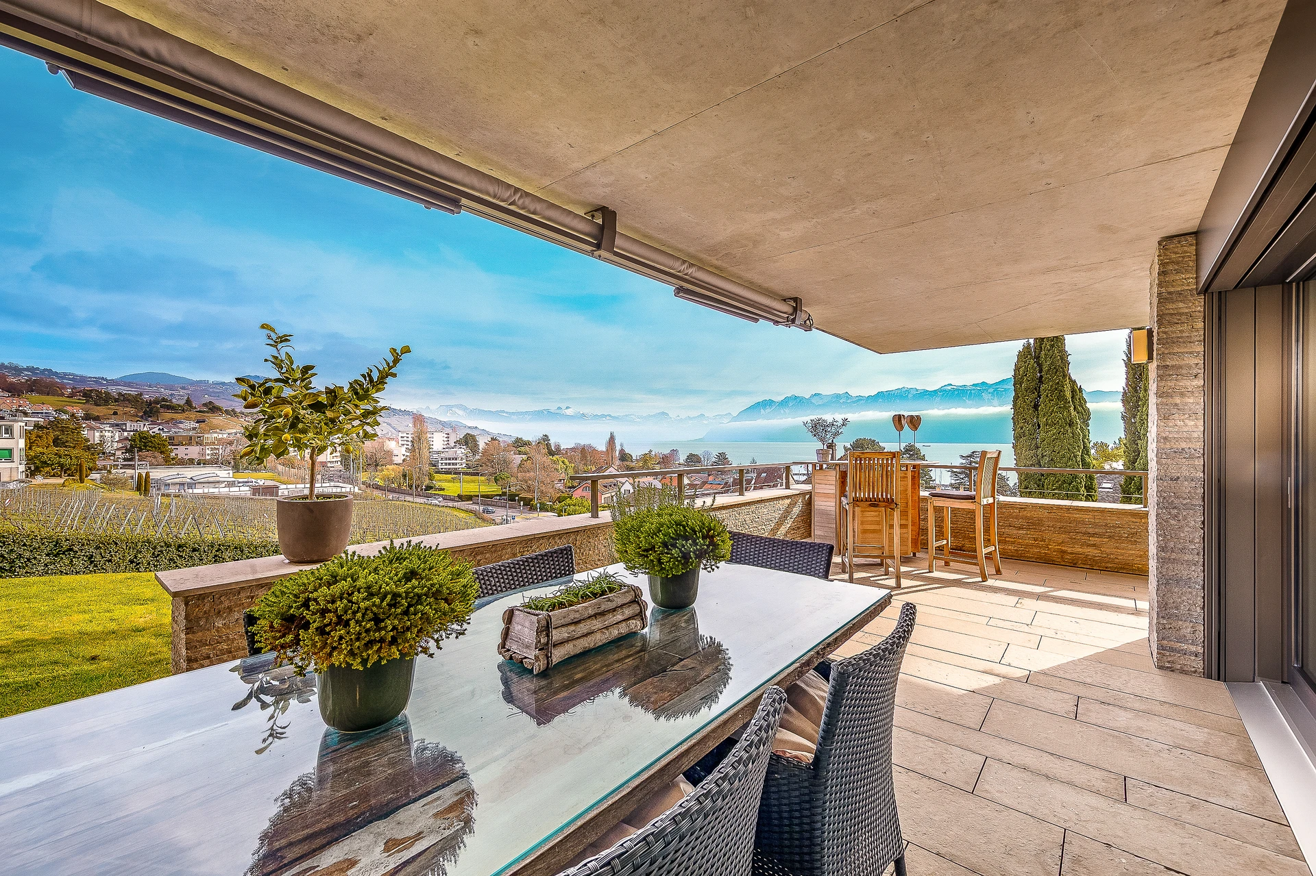 Built in 2014 and entirely redesigned during a complete renovation in 2021, the property stands out for the quality of its finishes and the meticulous attention given to every detail. Offering approximately 218 sqm of living space, it opens generously onto several terraces, unveiling breathtaking views over the lake, the Alps, and the renowned vineyards listed as a UNESCO World Heritage Site.