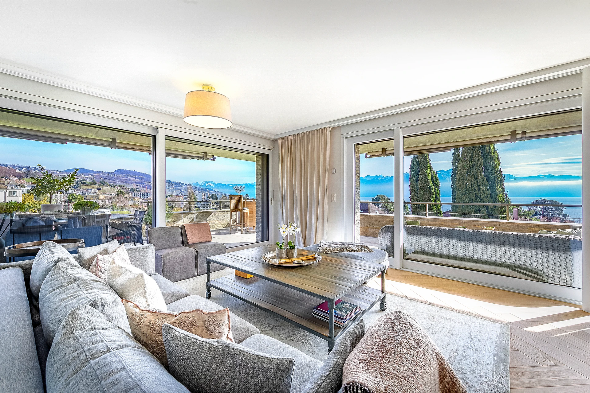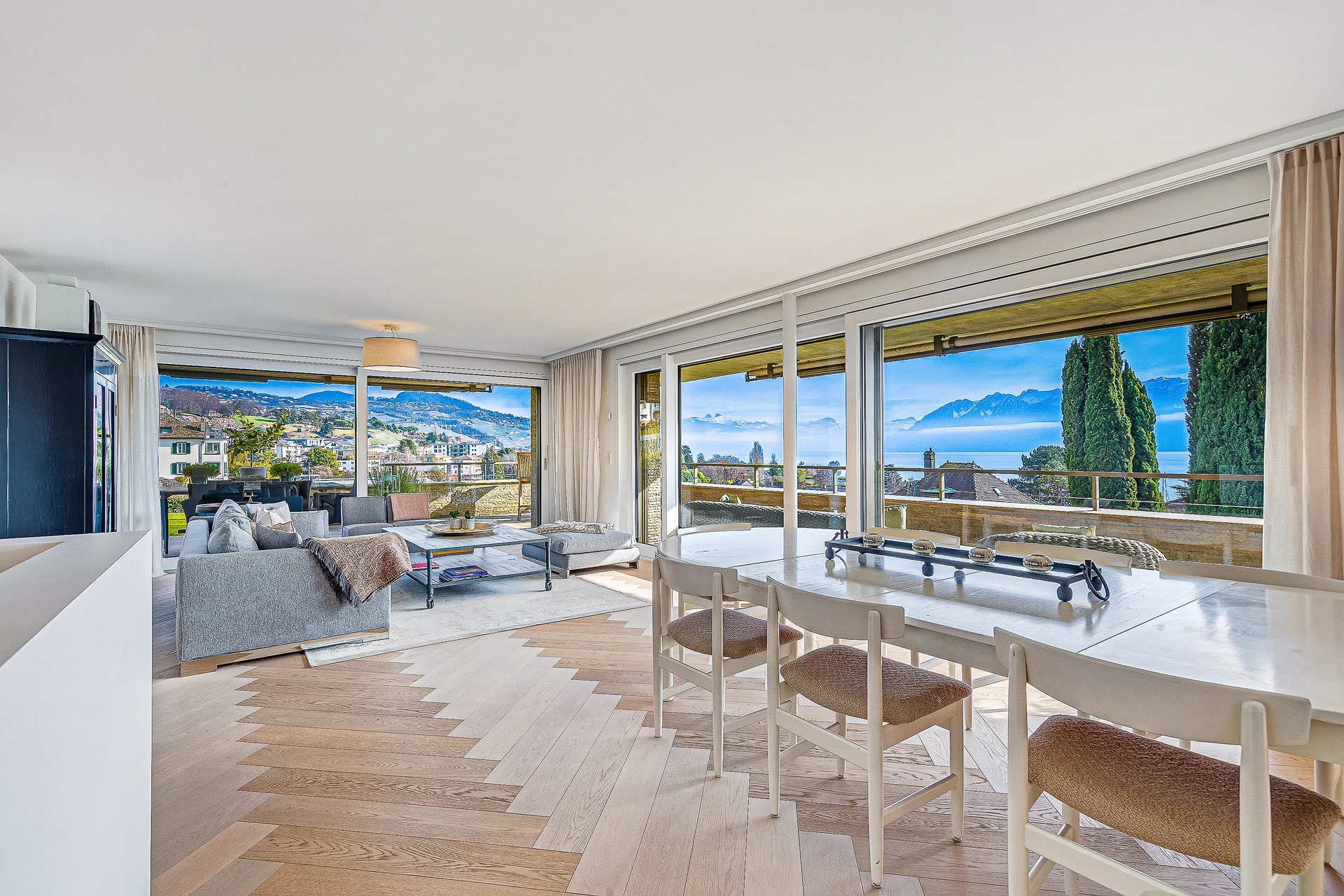Édifiée en 2014 puis entièrement repensée lors d’une rénovation complète en 2021, la propriété se distingue par la qualité de ses finitions et l’attention portée à chaque détail. Développant une surface habitable d’environ 218 m², elle s’ouvre généreusement sur plusieurs terrasses, dévoilant un panorama à couper le souffle sur le lac, les Alpes et les célèbres vignobles classés au patrimoine mondial de l’UNESCO.