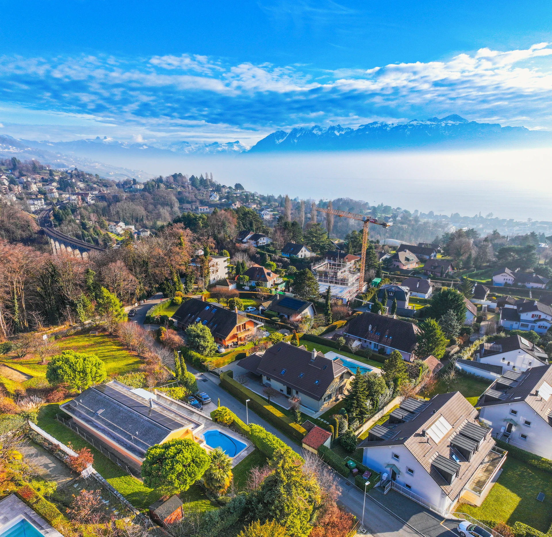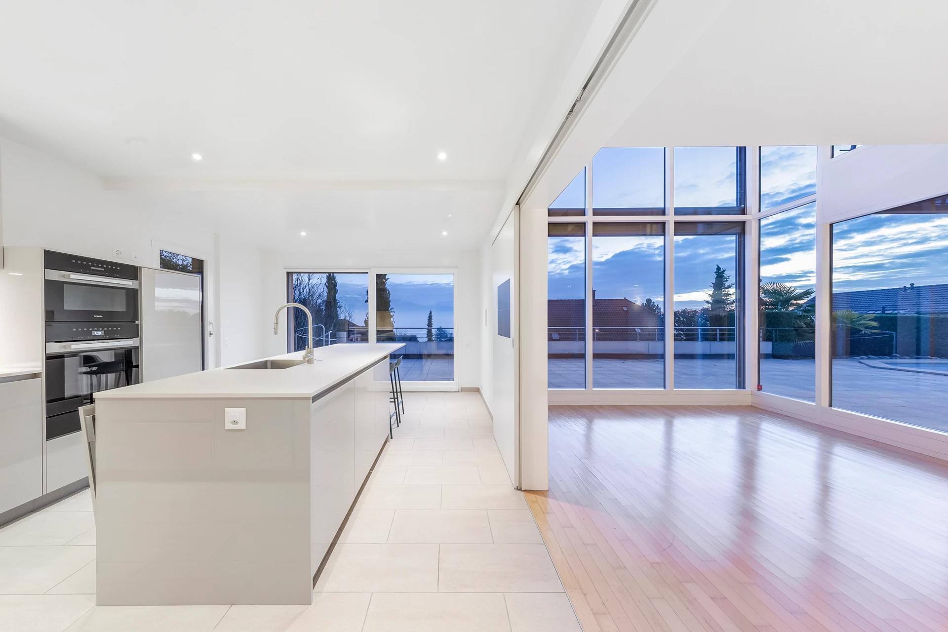 La propriété séduit par sa vue dégagée sur le lac et les Alpes, visible depuis les principaux espaces de vie et des chambres. La vaste pièce de réception (poêle), baignée de lumière, s’ouvre harmonieusement sur l’extérieur et constitue le cœur de la maison, idéale pour recevoir en toute convivialité.